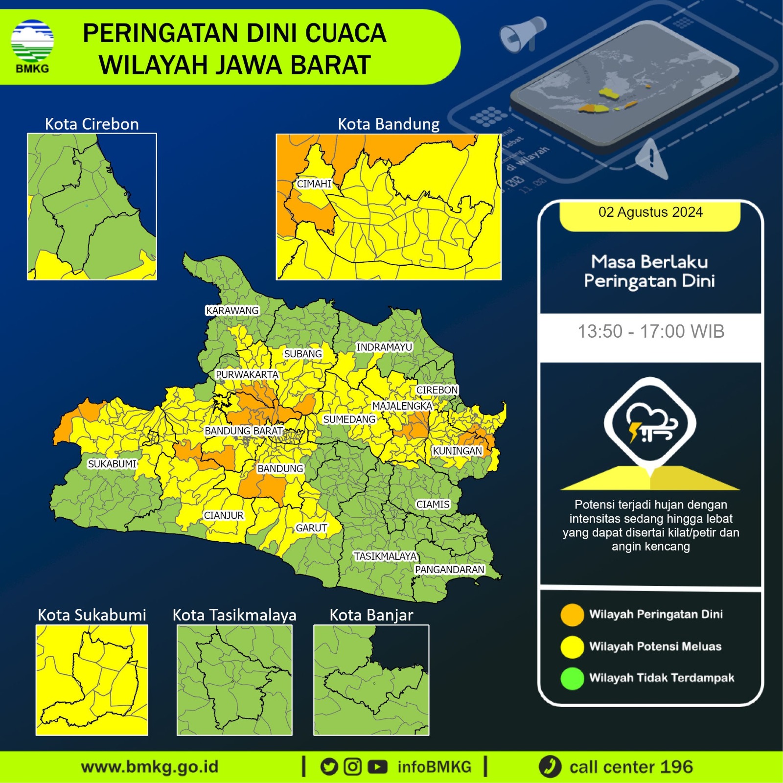 Badan Meteorologi, Klimatologi dan Geofisika (BMKG) merilis peringatan dini cuaca di wilayah provinsi Jawa Barat, Jumat (2/8/2024). BMKG memprediksi hujan sedang hingga lebat disertai kilat dan amgin kencang berpotensi terjadi pada pukul 13.50 wib hingga petang nanti pukul 17.00 wib.