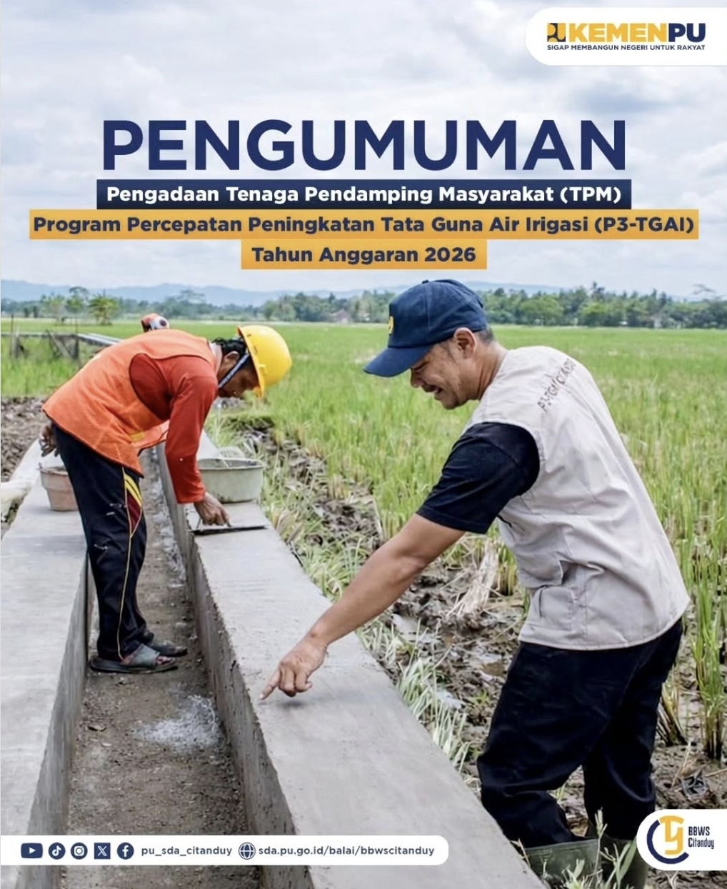 Balai Besar Wilayah Sungai (BBWS) Citanduy di bawah naungan Kementerian Pekerjaan Umum resmi mengumumkan pembukaan Pengadaan Tenaga Pendamping Masyarakat (TPM) untuk Program Percepatan Peningkatan Tata Guna Air Irigasi (P3-TGAI) Tahun Anggaran 2026.