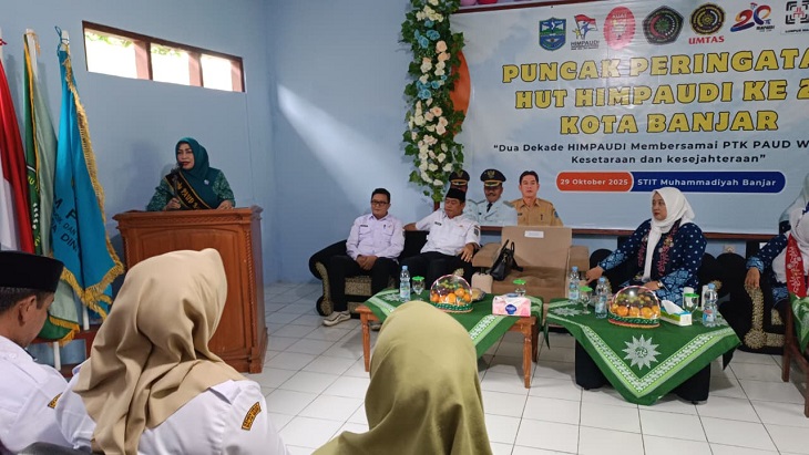 Puncak peringatan HUT ke 20 Himpunan Pendidik dan Tenaga Kependidikan Anak Usia Dini Indonesia (Himpaudi) Kota Banjar berlangsung meriah di Aula Sekolah Tinggi Ilmu Tarbiyah (STIT) Muhammadiyah Banjar, Jawa Barat, Rabu (29/10/2025).