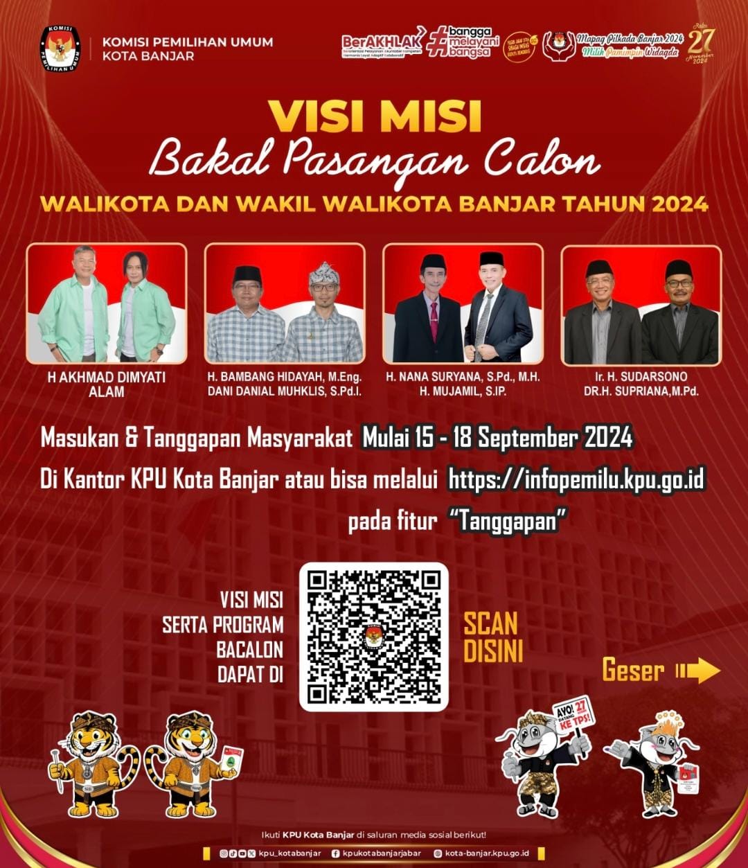 Mulai Minggu (15/9/2024) Komisi Pemilihan Umum (KPU) Kota Banjar belum menerima satupun surat masukan dan tanggapan dari masyarakat terkait bakal pasangan calon yang lolos administrasi. Masyarakat bisa mengirim masukan dan tanggapan terhadap kelulusan administrasi seluruh bakal pasangan calon Walikota dan Wakil walikota Banjar melalui surel di laman resmi KPU yakni https://infopemilu.kpu.go.id maupun surat langsung ke kantor KPU Kota Banjar.