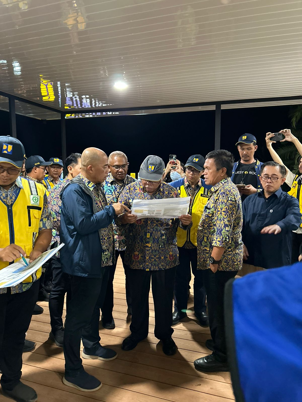 Menteri Basuki dan rombongan langsung meninjau kondisi bendungan utama Leuwikeris di gardu pandang. Tampak Menteri Basuki memeriksa kesiapan dan melihat peta bendungan.