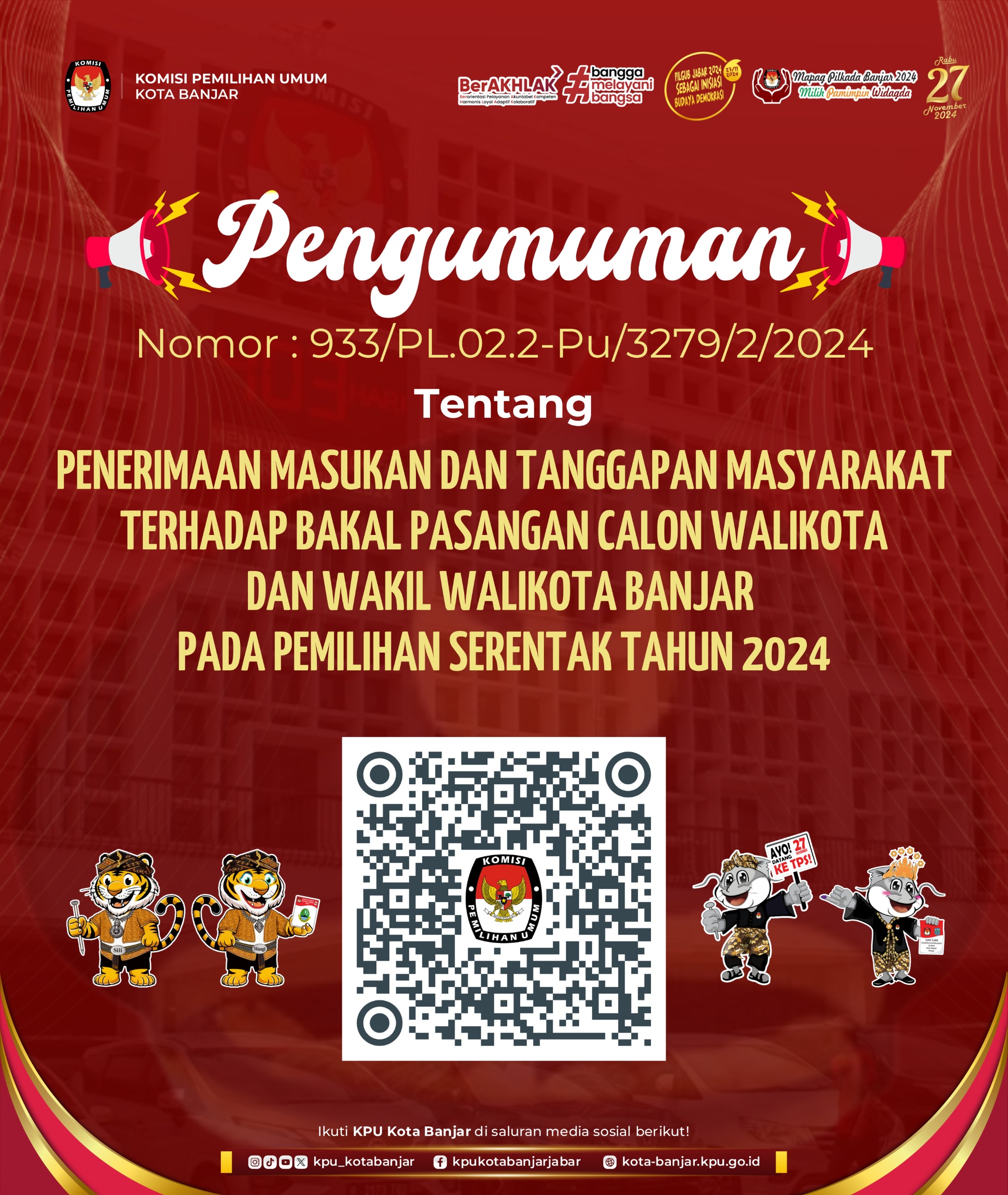 Pengumuman No 933/PL.02.2-Pu/3279/2/2024 Tentang Penerimaan Masukan dan Tanggapan Masyarakat Terhadap Bakal Pasangan Calon Walikota dan Wakil Walikota Banjar 2024 Pemilihan Serentak 2024