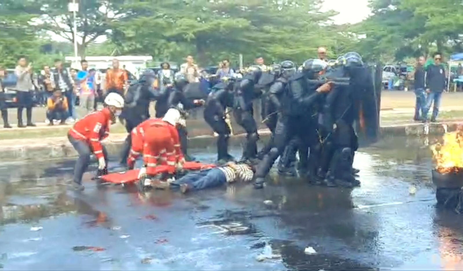 Kerusuhan tersebut merupakan operasi Mantap Praja Lodaya 2024 yang menjadi salah satu rangkaian simulasi pengamanan Pilkada serentak yang digelar oleh TNI Polri di Gelora Banjar Patroman, Selasa (6/8/2024). Simulasi melibatkan seluruh elemen masyarakat.